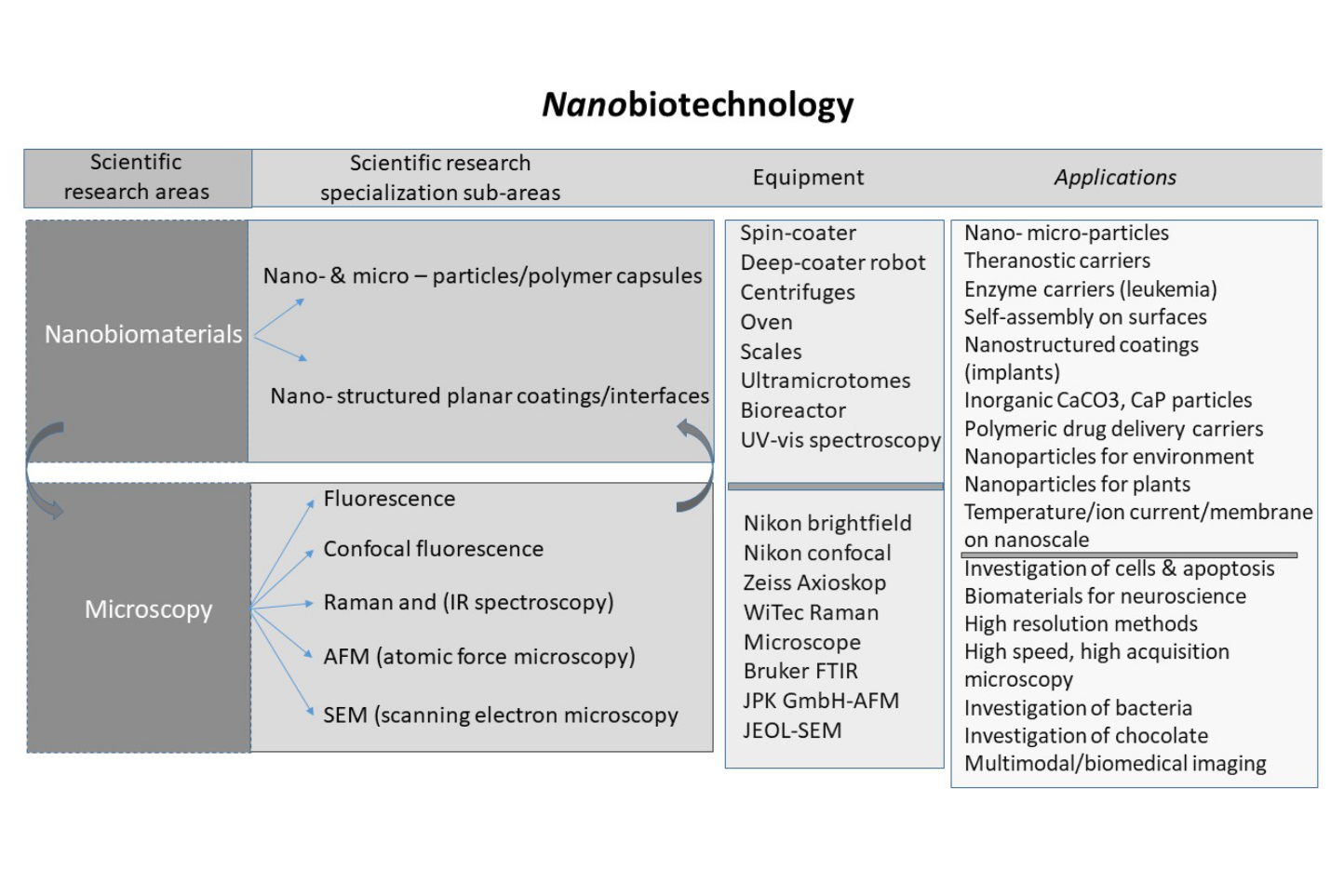 The main research areas, the specialization research sub-areas, equipment, and targeted applications can be seen in the following table.
