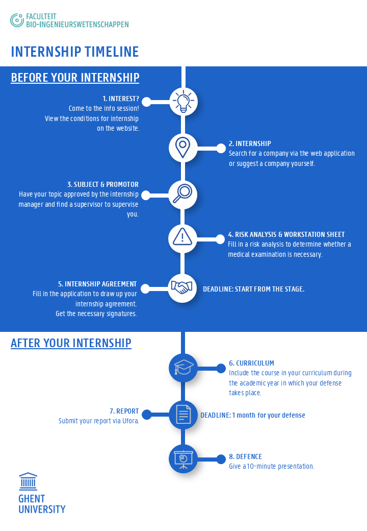 Inform the Faculty Student Administration (fsa.fbw@ugent.be) as soon as possible if you plan an internship during the academic year so they can plan your defence accordingly.