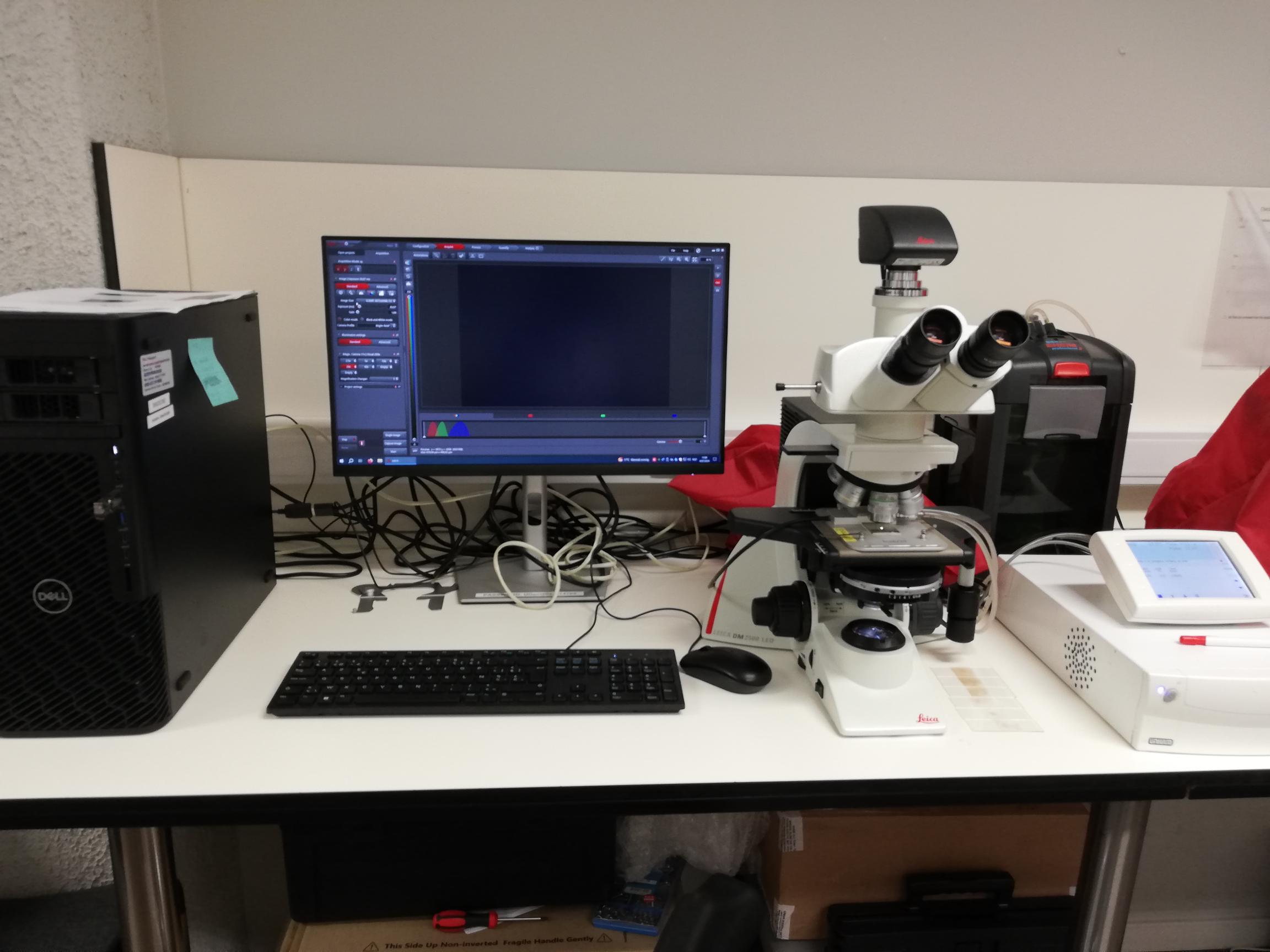 The light microscope can be used in normal light transmission mode, phase contrast mode or in polarization mode and is equipped with a Linkam stage for temperature control. |