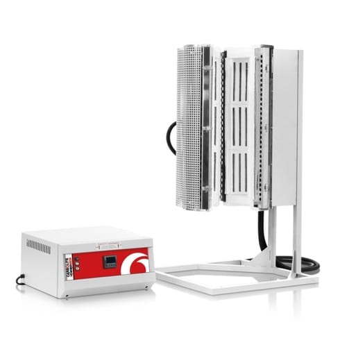 Vertical packed bed reactor, externally heated by a tube furnace and flushing gas preheater. PID temperature control to maximum 800 °C. Reactor volume is ca. 250 ml, typically allowing for 150 g of biomass to be pyrolysed. Highly versatile and manually operated, the reactor has multiple in-bed temperature probes, and can also be operated as a fluidized bed. An ice-bath cooling system allows the collection of condensable vapours, while the non-condensable gases can be metered and sampled.