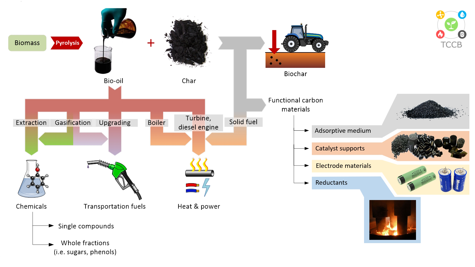 The core biomass conversion platform of TCCB's is pyrolysis with different research lines detailed below: