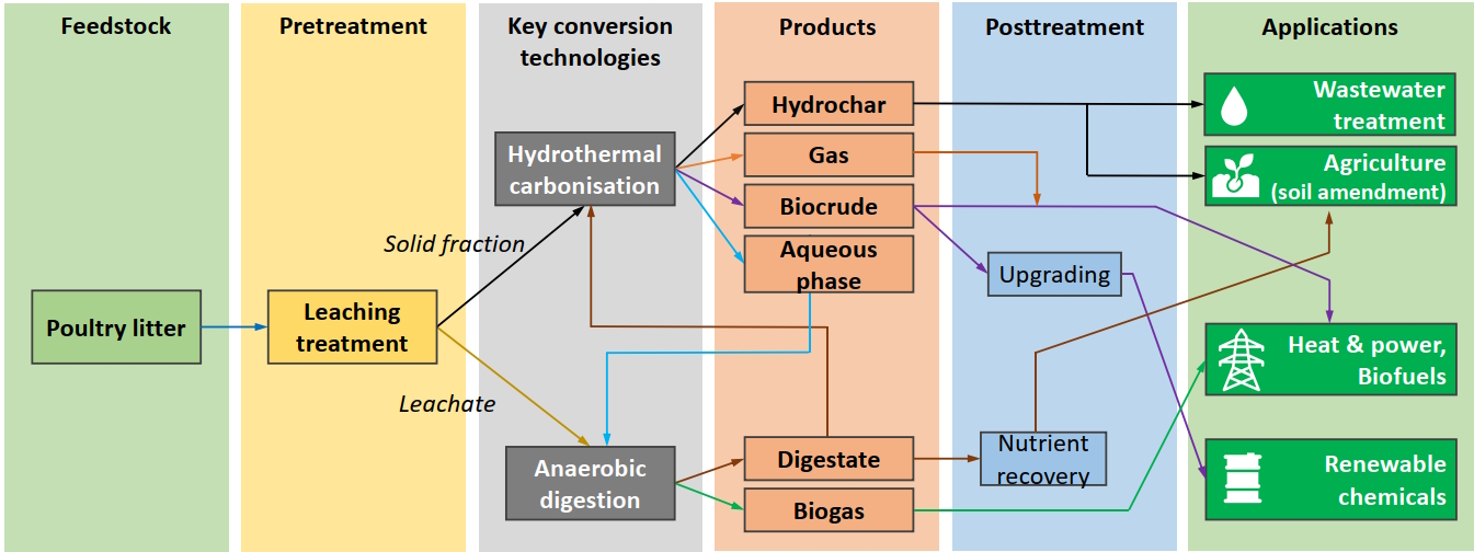 This project studies flexible schemes for the valorization of poultry manure, considering the use of poultry manure leaching as pre-treatment and then conversion by Hydrothermal Carbonisation (HTC). The aqueous phase of HTC is proposed as feedstock in a high-efficiency anaerobic reactor. The possible applications of all products will then be evaluated. Finally, a life cycle assessment will be carried out to determine the most sustainable alternative.