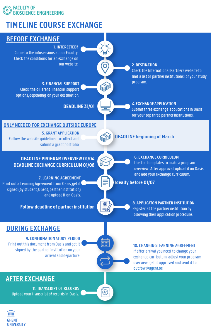 • The academic calendar of the partner institution. If the semester starts during the exam period at Ghent University, you can ask the envolved teachers to move the exam. Keep in mind that teachers are not obligated to agree to this request. Sometimes it is also possible to take the exam online or at the partner institution, under supervision of a colleague at your destination.