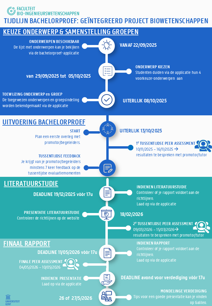 In de Tijdlijn Bachelorproef Biowetenschappen vind je terug wat de stappen zijn en wat je wanneer moet uitgevoerd hebben: