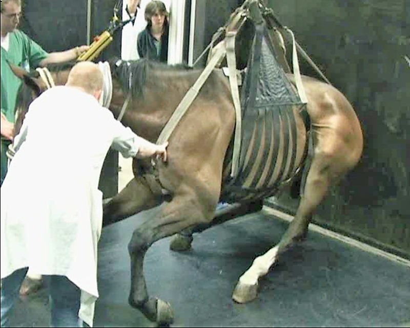 Paarden kunnen we in speciale boxen plaatsen tussen twee wanden, voor ze gaan liggen. Zo zinken ze rustig door hun benen en vallen ze niet zijdelings om. Als het nodig is (bv. bij breuken) plaatsen we uw paard in een houder (singel) die aan een takel hangt. Zo valt uw paard hangend in slaap en kunnen we het rustig op de operatietafel neerleggen.