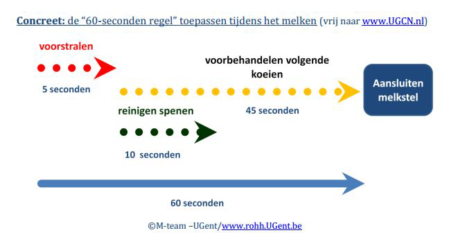 Vóór het melken is bij melkkoeien een klein volume van de totale hoeveelheid melk in de uiercisternes opgeslagen. Deze kleine hoeveelheid melk is onmiddellijk beschikbaar als het melkstel wordt aangesloten. Door voor te stralen en de spenen te reinigen, wordt in de hersenen het hormoon 'oxytocine' vrijgesteld dat ervoor zorgt dat de koe haar melk die hogerop aanwezig is, laat "schieten". Het duurt echter ongeveer 60 seconden alvorens het hormoon het uierweefsel bereikt. Door de "60-seconden regel" toe te passen, lopen het wegmelken van de aanwezige melk in de uiercisternes en het laten "schieten" van de melk vloeiend in elkaar over. Daardoor is de uier sneller leeggemolken met kortere melktijden, minder beschadiging van het slotgat en minder kans op uierontsteking tot gevolg. De "60-seconden regel" kan in de praktijk gemakkelijk toegepast worden door eerst een aantal koeien voor te behandelen en daarna terug te keren naar de eerste koe om het melkstel aan te hangen. Zo kunt u door 60 seconden te "wachten" … tijd winnen.