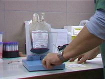 Na het scheiden: een zak PRBC (‘packed red blood cells’, links) en een zak plasma