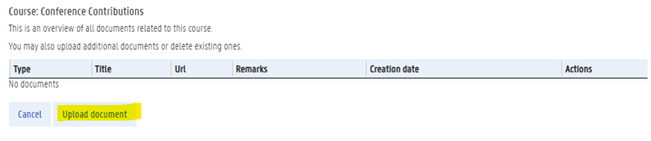 Choose type (Conference is only possibility) > fill in title & url or fill in title and upload document (if you don’t add a valid url, you must upload a document) > Save