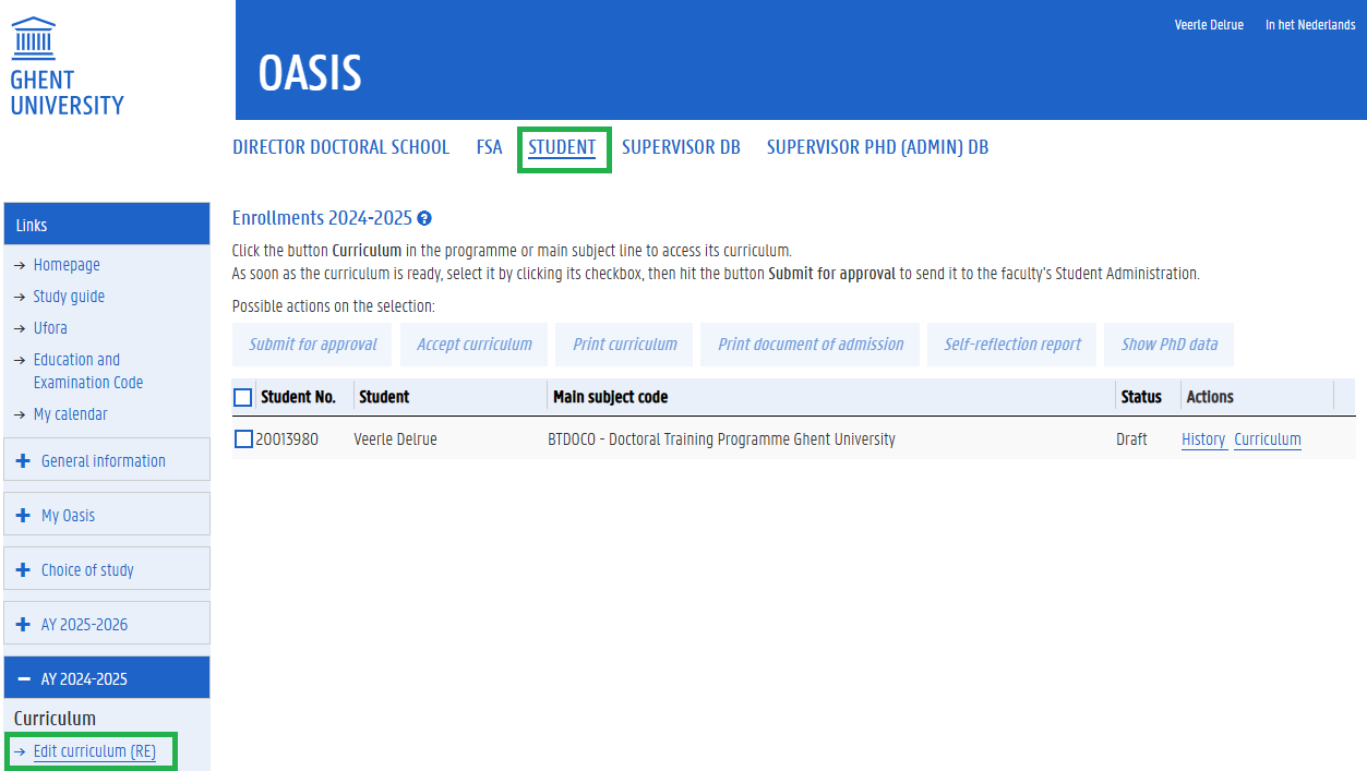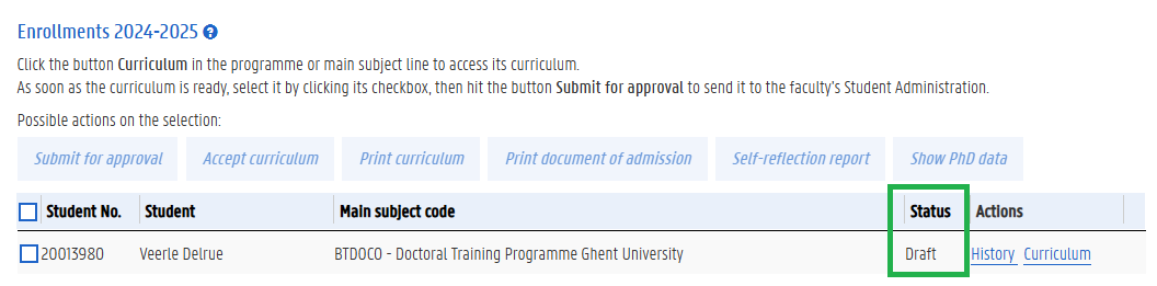 After choosing ‘back’, you can see the status of your curriculum is still ‘draft’. As long as your supervisor has not yet provided a recommendation on your self-reflection report, you’ll still be able to continue editing your curriculum.