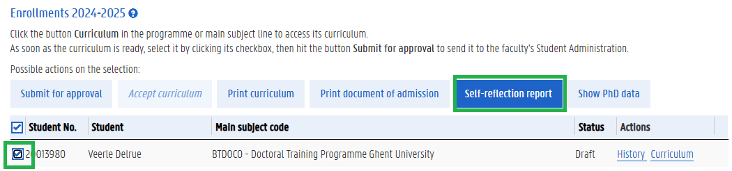 Tick the small box left of your student number and select ‘self-reflection report’ (on top)