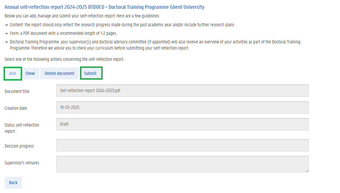 Choose ‘add’ and upload the PDF file with your actual research report. Please note that only the PDF format is allowed. You can verify that you uploaded the correct PDF by clicking 'Show'. Next choose ‘submit’. Your supervisor(s) and doctoral guidance committee (if appointed) will then receive a request to evaluate your self-reflection report and curriculum.