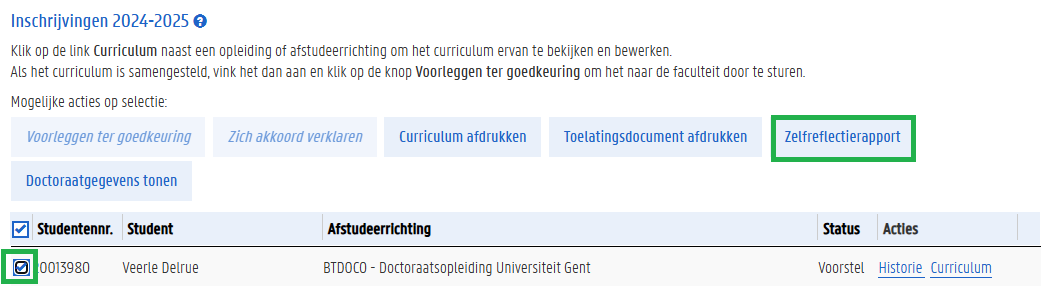 When choosing ‘curriculum’ > ‘view entire curriculum’ you will see that the status of your self-reflection report is ‘proposal’.