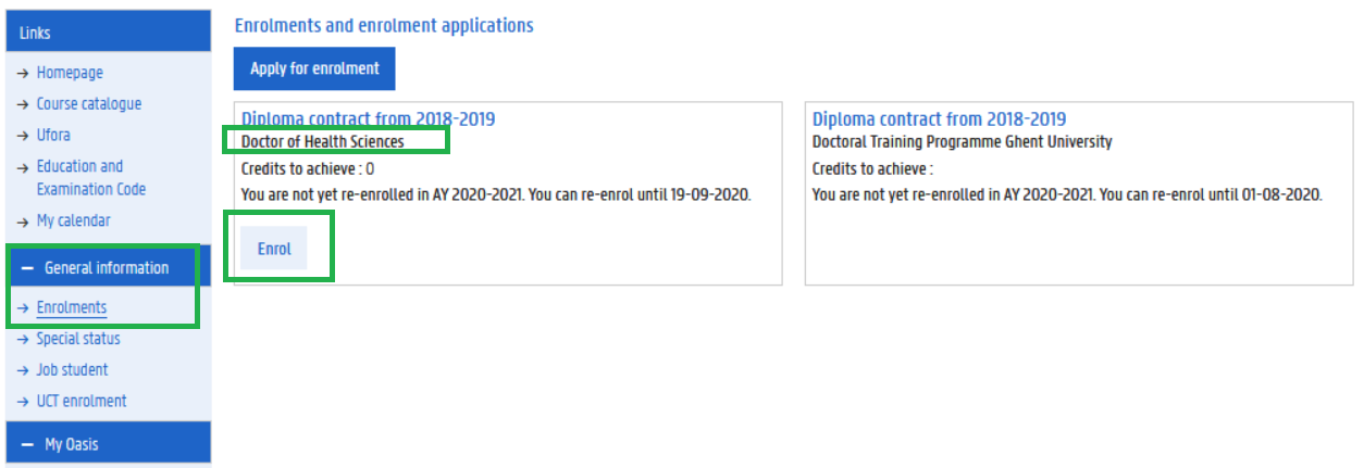 After your supervisor has registered a positive recommendation, you will be notified by e-mail that you are able to re-enrol online, simultaneously for the doctorate and the DTP, through OASIS. Please do not forget to re-enrol before 1 October. In order to re-enrol, select 'General information' > 'Enrolments' (left margin) and click 'Re-enrol'.