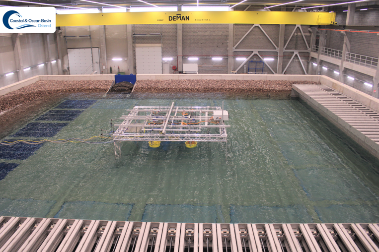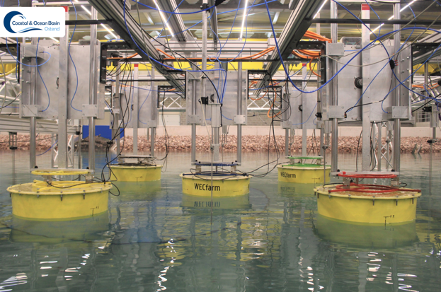 Wave energy is a renewable form of energy which is largely untapped. Wave energy converters (WECs) are devices designed to harness this energy source and convert it to electricity. The last decades a considerable effort has been made by industry and academia to bring WECs to a commercial stage. There is a need for available real-life data to validate numerical models in the wave energy sector. However, publicly available databases from WEC array experiments are limited due to the high cost and complexity of conducting such experiments. The ‘WECfarm’ project, initiated by Ghent University, aims to improve the understanding of interactions between the individual WECs within an array, and address the need for experimental data on WEC array tests. A team from the Coastal Engineering Research Group of Ghent University performed experiments focused on the extraction of wave energy using an array of five point absorber WECs. Similar to offshore wind turbines, multiple point absorber WECs will be installed in an array configuration, to increase the total capacity, and to benefit from the economies of scale. Whereas wind turbines always interact destructively due to wake effects, WECs can interact constructively, since hydrodynamic interactions between the WECs occur through radiation and diffraction of waves, changing the direction of the incoming wave energy.