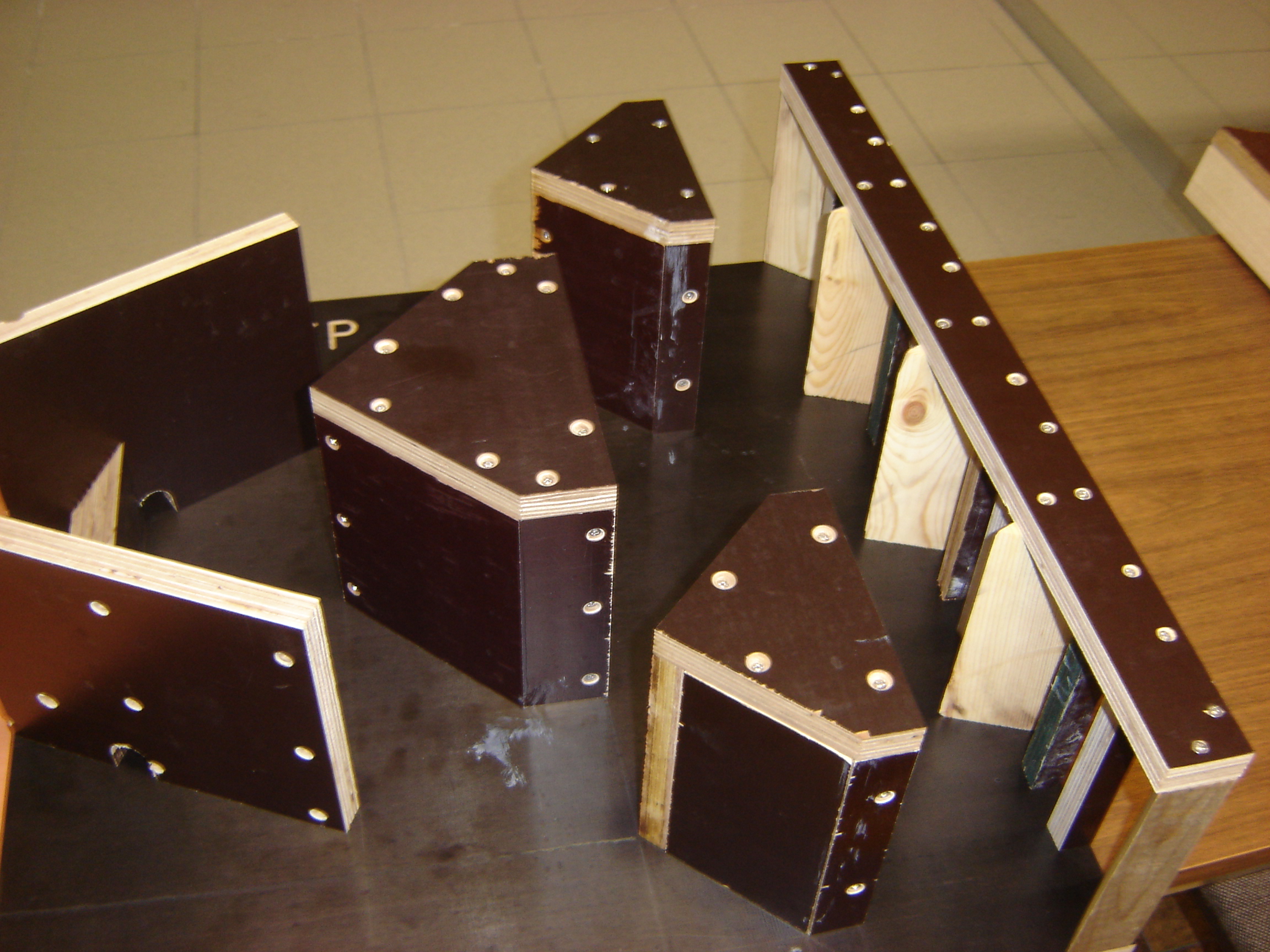 The first picture below shows a construction for a dissipation basin for a navigation lock, designed by students during a course. The designed basins were tested in a scale model. The other pictures show the results of a master thesis, modeling a labyrinth weir integrated in a culvert: the architectural model, the scale model tested and the scale model in operation.
