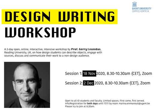 Deze tweedaagse online workshop werd in het academiejaar 2020-21 georganiseerd als onderdeel van de educatieve activiteiten van de afdeling IO en het .education-pijlerteam. Het ging over de manier waarop ontwerpers kunnen leren om hun creaties te beschrijven met behulp van de juiste terminologie en procedures, en om dit op een begrijpelijke manier te schrijven voor zowel ontwerpend als niet-ontwerpend publiek. Hands-on activiteiten en rollenspel waren methoden die gebruikt werden om het expressieve schrijfpotentieel van designstudenten te ontsluiten, zodat ze hun werk effectief en efficiënt kunnen communiceren naar het publiek. Het doel was om de silo's aan te pakken die vaak ervaren worden tussen professionals en leken in het begrijpen van ontwerpprocessen en -resultaten. Prof. Gerry Leonidas van de Reading University (UK) was de gastdocent met ervaring in academische kennisoverdracht workshops, curriculumontwerp, onderzoeksmethoden, cursusplanning, feedback en evaluatie van studenten, en het integreren van onderzoek in de praktijk.