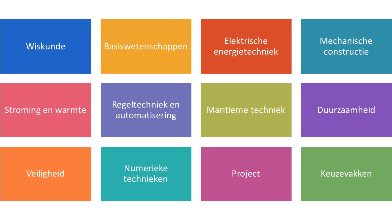 De plichtvakken in de verschillende afstudeerrichtingen vind je hieronder, gekleurd volgens de voornaamste leerlijn waar ze deel van uitmaken.