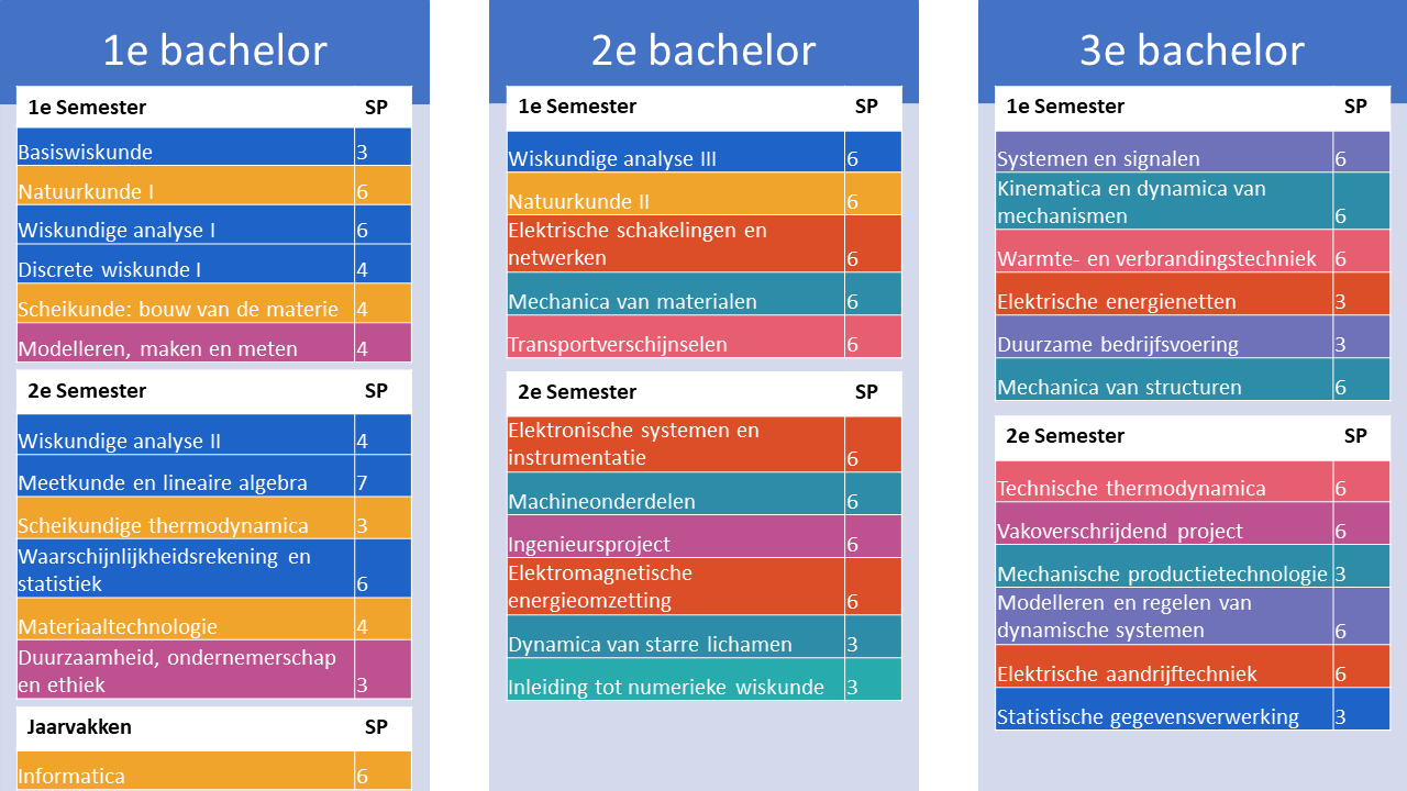In de bachelor werktuigkunde-elektrotechniek wordt een brede basis gelegd voor de master met de nodige kennis over en inzicht in elektriciteit, mechanica, thermodynamica en materialen. In de figuur hieronder kan je deze vakken, het jaar waarin ze gegeven worden en het aantal studiepunten vinden. Ze zijn gekleurd volgens de leerlijn waartoe ze het meest behoren, maar een vak kan natuurlijk tot meerdere leerlijnen behoren. Het vakoverschrijdend project maakt bijvoorbeeld deel uit van bijna alle leerlijnen.