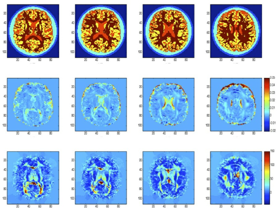Realistic head model with calculation of induced eddy currents with the inclusion of anisotropy using DTI. First row shows the anatomical volume conductor model, second row shows the difference between the induced currents using anisotropy and the induced currents using isotropy, third row shows the percentual difference between the induced currents with incorporation of anisotropy and without anisotropic conductivities.