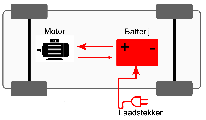 Heeft een batterij met ‘grote’ capaciteit die via een omvormer de elektromotor aandrijft.