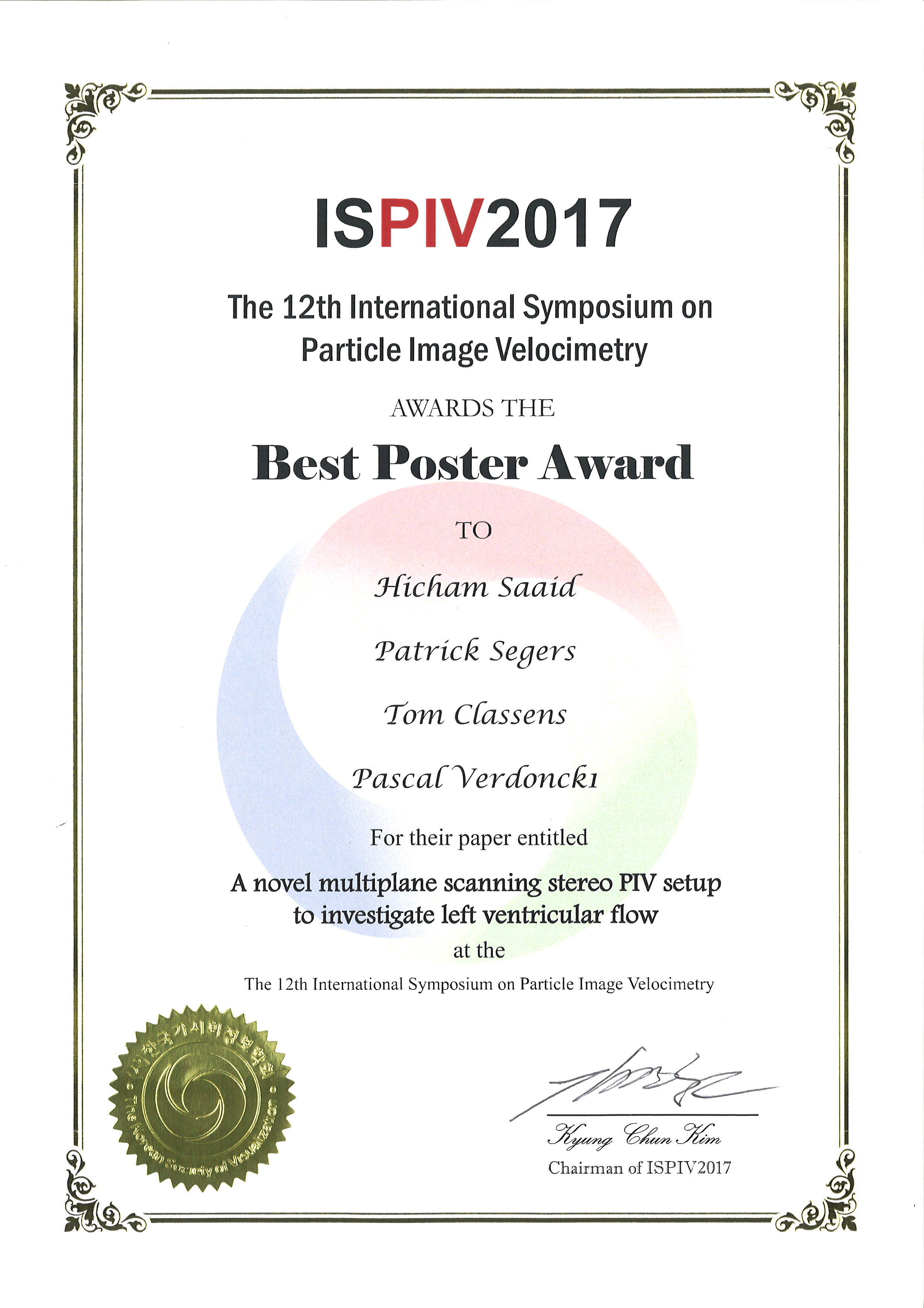 ISPIV 2017 best poster award ISPIV 2017 best poster award Hicham Saaid has won the best poster award at the 12th international symposium on particle image velocimetry with the work "a novel multiplane scanning stereo PIV setup to investigate left ventricular flow".