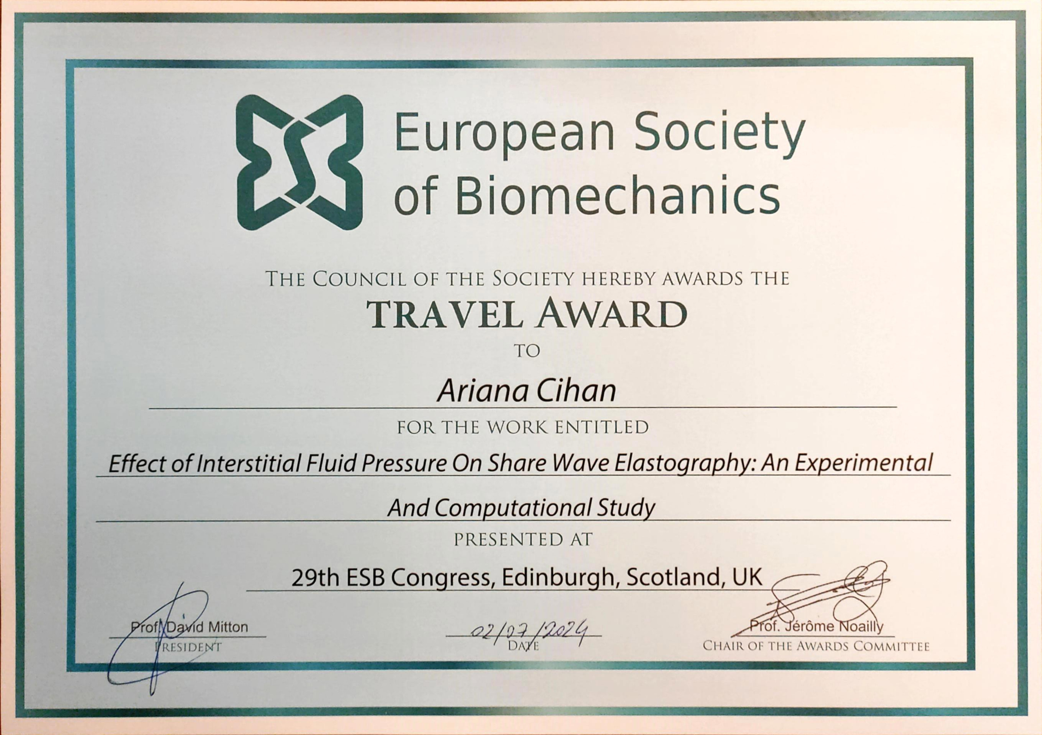 Ariana Cihan has won the travel award at the 29th European Society of Biomechanics congress that took place in Edinburgh, Scotland from 30th June to 3rd July 2024 with the work "Effect of interstitial fluid pressure on shear wave elastography: an experimental and computational study".