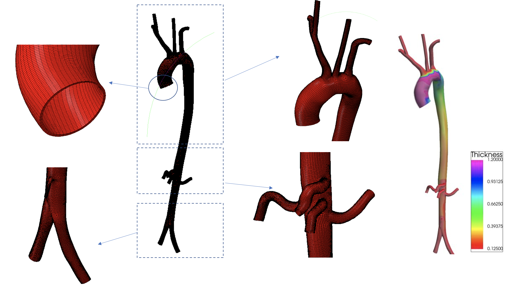 In order to implement the algorithm developed in-house, a structured, hexahedral mesh is necessary to solve the structural equations. This is obtained by generating an initial blocking structure of the aortic surface. Once a good quality surface mesh with quadrilateral elements is obtained, an in-house developed code is used to offset the surface and generate a structured hexahedral mesh ( as shown in Figure 2). A function is used to ensure the thickness of the artery is correspondent to the local radii in the artery as shown in Figure 2.