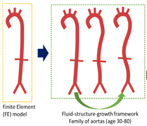 We aim to implement the growth and remodeling algorithm developed in-house at KU Leuven to the baseline geometry of a 30 year old healthy patient obtained from literature. A constrained mixture theory is used to computationally model growth and remodeling of ageing and the mentioned algorithm is implemented in the Finite Element solver ABAQUS. The aim would be to numerically grow the heart from the age of 30 to 80 using the aforementioned theory as illustrated in Figure 1 and to validate results using the Asklepios in-vivo database.
