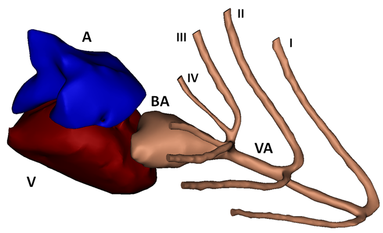 Compared to mice, using zebrafish as an animal model has several advantages: for example easier maintenance, lower cost, easier genetic manipulations and a high throughput potential. Looking at the cardiovascular structures (limited overview in Figures 1, 2 and 3), there are some important anatomic differences. Only two heart chambers are present (1 atrium, 1 ventricle) compared to the 4-chambered human (and mouse) heart. Also, not the lungs but gills and gill vasculature ensure oxygen supply to the fish. In between the ventricle and the (branched) ventral aorta, the bulbus arteriosus is located. The bulbus arteriosus is a peculiar component and serves as an elastic reservoir. Through its buffer working or ‘Windkessel’ effect, pressure peaks are damped and flow towards the delicate gill vasculature is extended. All these differences could seem alarming at first, but zebrafish are 70% genetically similar to humans and they even suffer from the same heart problems. Zebrafish genetic models have already recapitulated numerous human cardio¬vascular disorders.