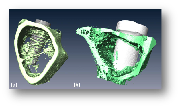 Although histology has proven to be a reliable method to evaluate the ossoeintegration of a dental implant, it is costly, time consuming, destructive, and limited to one or few sections. Micro Computed Tomography, or µCT, is fast and delivers three-dimensional information, but this technique has not been widely used and validated for histomorphometric parameters yet. This study compared µCT and histomorphometry by means of evaluating their accuracy in determining the bone response to two different implant materials.