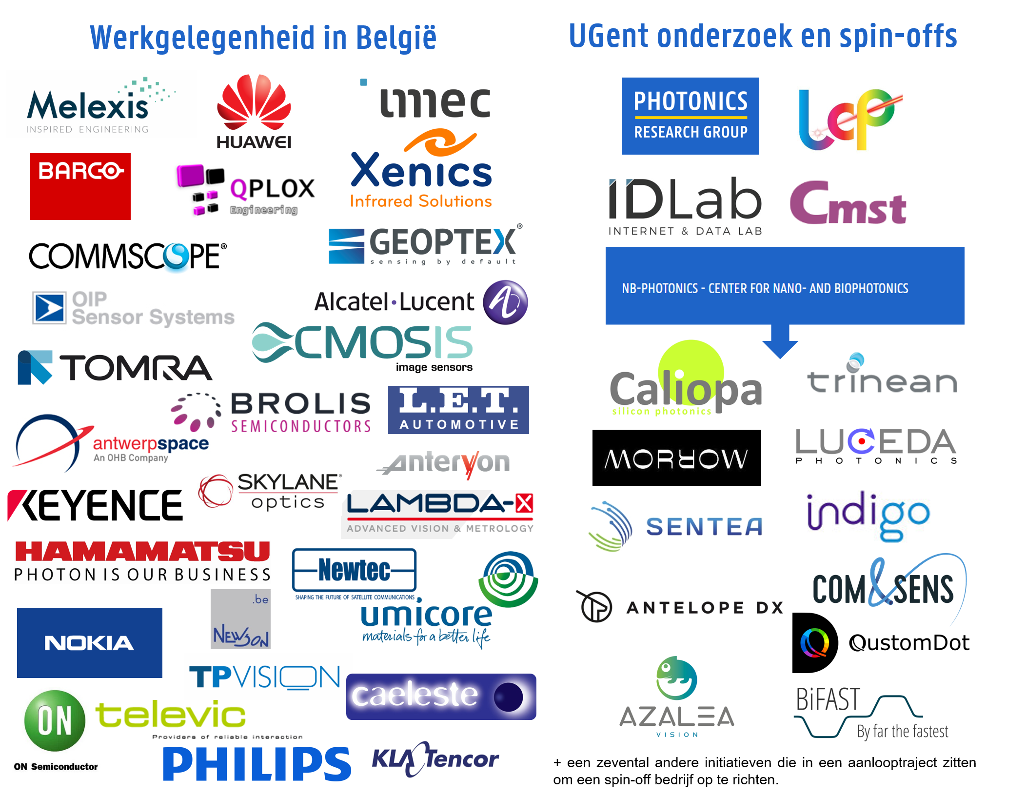 Onze fotonica-ingenieurs komen terecht in een diverse waaier van bedrijven, zowel in binnenland als buitenland. Daar staan ze in voor de ontwikkeling van uitdagende nieuwe producten in telecom, healthcare, sensing, energie, … en groeien ze later vaak door naar leidinggevende functies. Er is ook een heel ecosysteem van fotonica-spinoffs in het Gentse, waar toponderzoek van onze universiteit gevaloriseerd wordt. Zo zijn er in de laatste 10 jaar al 11 spin-offs in het gebied van fotonica opgestart en met momenteel al nog 7 andere projecten in de aanloopfase, ziet het er naar uit dat de komende jaren dit ecosysteem nog verder wordt uitgebouwd.