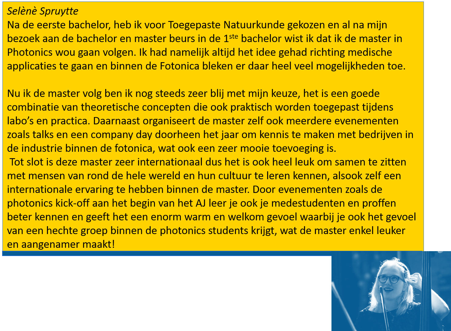 Contacteer gerust de voorzitter van de opleidingscommissie, prof. Peter Bienstman (via MS Teams of via email op peter.bienstman@ugent.be)