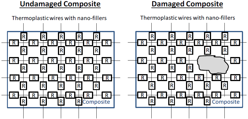 Figure 1. Sensor strategy for monitoring composites by thermoplastic wires with nano-fillers