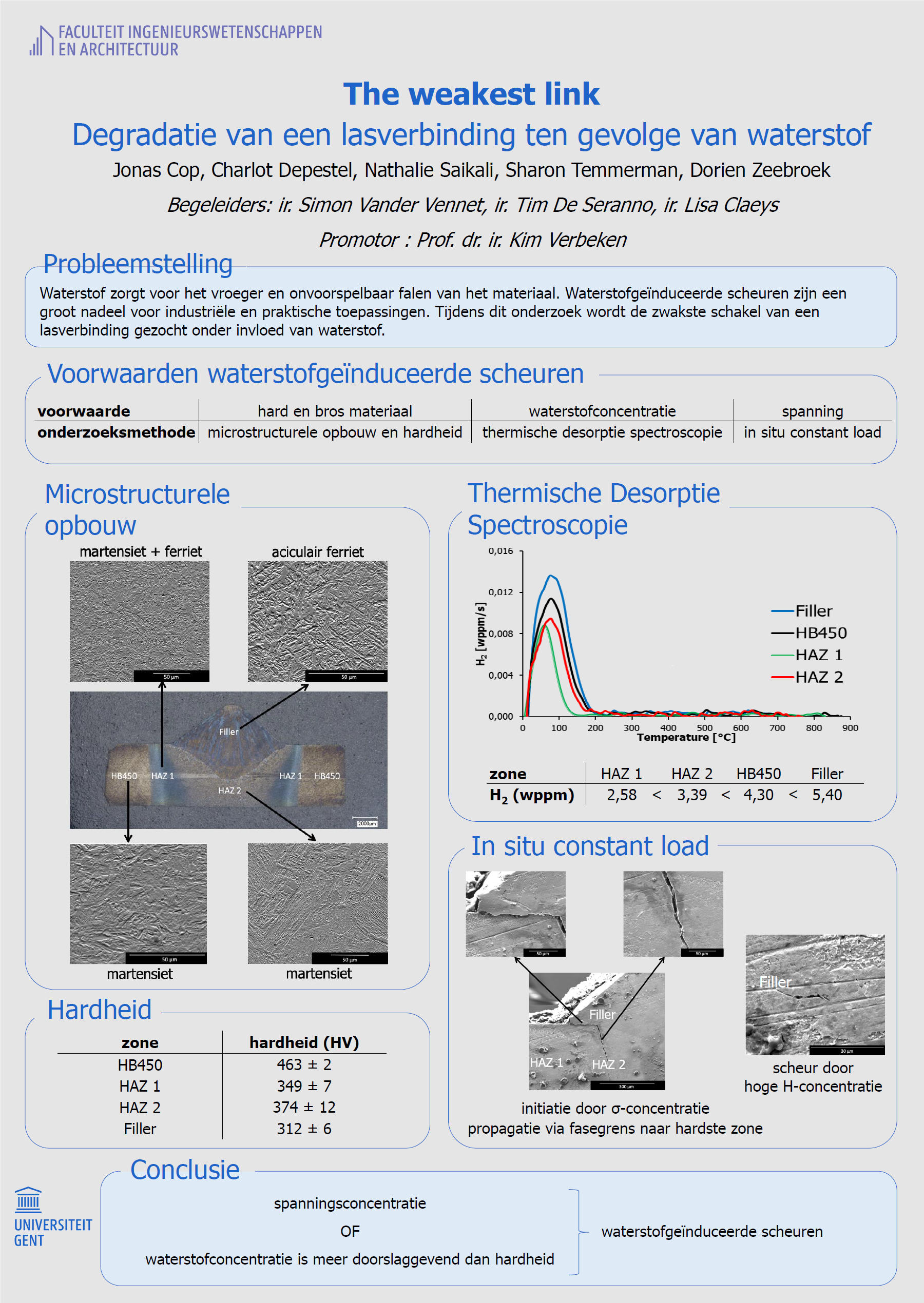 Waterstof wordt gezien als een belangrijke energiebron in de toekomst. Sommige materialen kunnen echter degraderen door contact met waterstof wat leidt tot een kortere levensduur. Om dit belangrijke probleem te begrijpen en op te lossen, onderzochten studenten in dit project wat de invloed is van waterstof op een lasverbinding. Zo kon er gemeten worden hoe scheuren ontstaan in het materiaal aan spanningsconcentraties en hoe die vervolgens propageren in de brosse zones van het materiaal. Deze inzichten laten toe om de materialen verder te optimaliseren en hun levensduur te verbeteren!