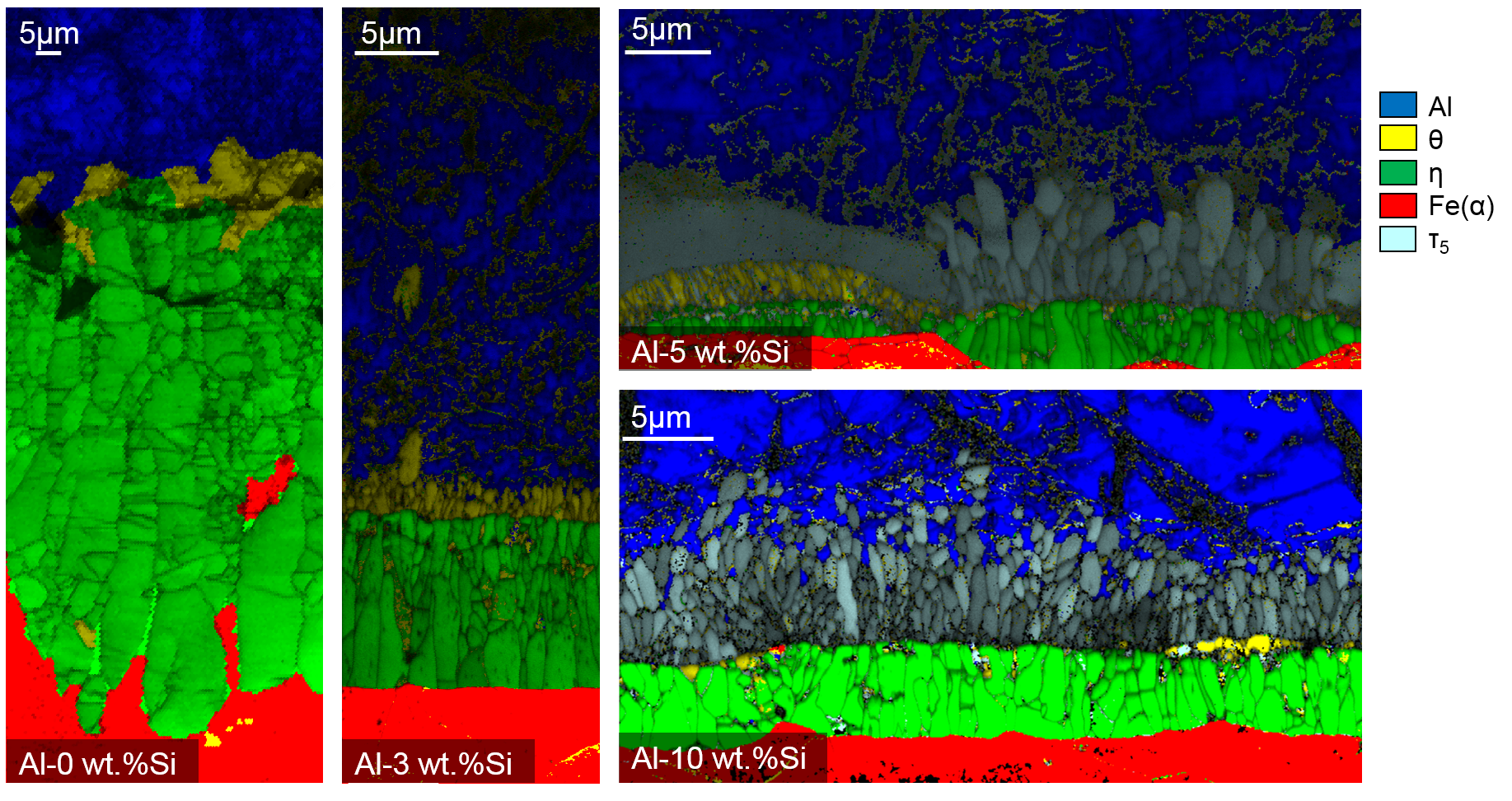 Phase maps of hot-dip aluminzed steel dipped in pure Al (left), Al with 3% Si (middle), Al with 5% Si (top right) and Al with 10% Si (bottom right), obtained via electron backscatter diffraction.