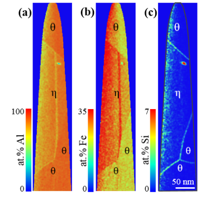2-dimensional concentration plots of Al (a), Fe (b) and Si (c) of the intermetallic phases, obtained via atom probe tomography.