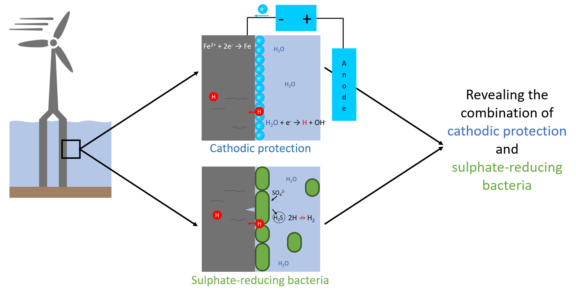 Offshore structures are exposed to corrosive seawater and should be protected to avoid possibly catastrophic failures. Offshore corrosion protection is usually achieved by combining protective coatings and cathodic protection (CP). However, irregularities in the environment can disturb the CP and cause cathodic overprotection, that promotes hydrogen reduction on the metal’s surface and causes an ingress of elemental hydrogen and, eventually, hydrogen embrittlement. A commonly encountered source of environmental irregularities is presence of microbial life in seawater. Sulphate-reducing bacteria (SRB) are most often associated with corrosion in offshore applications. The synergetic effect of cathodic protection and sulphate-reducing bacteria is still far from understood.