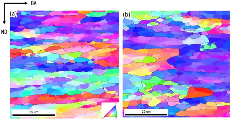 Inverse Pole Figure maps (obtained via EBSD) of a forged tungsten sample. (a) annealed at 1000 °C and (b) annealed at 1300 °C.