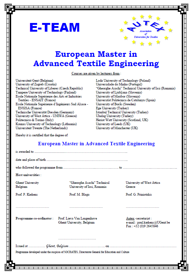 Studenten die de opleiding met succes afwerken, krijgen een diploma “Master of Sience in Textile Engineering” van de Universiteit. Daarenboven krijgen ze een certificaat dat ondertekend is door de universiteiten waar ze een semester doorbrachten.