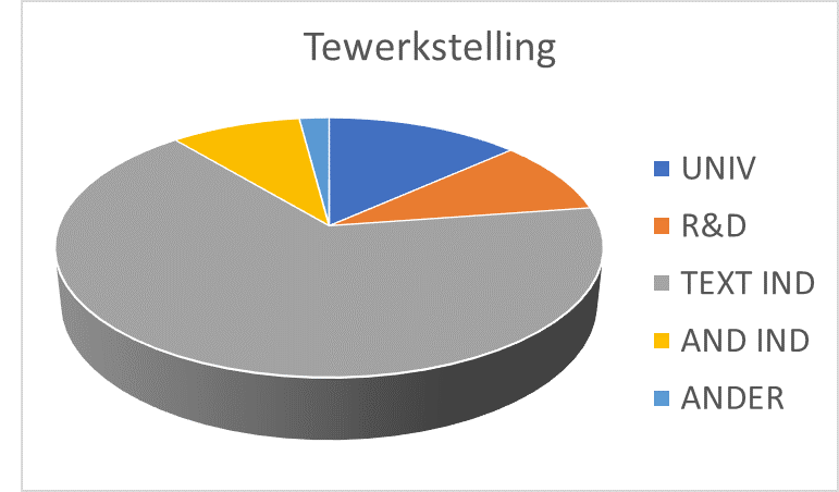 64% van de alumni kiest voor een baan in de textielindustrie. Nog eens 10% kiest voor een baan in een andere industriesector. Dit is dan meestal toelevering (chemische producten, machines) of afnemers (transport, medisch, meubel, …). Ook de materialenindustrie is een belangrijke werkgever.
