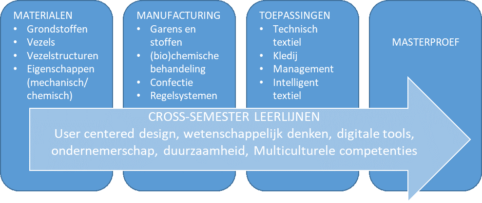 De basisgrondstoffen zijn (bio)polymeren, glas en metaal. Ook de productie van vezels komt aan bod. Verschillende vakken handelen over de textielstructuren en hun chemische en mechanische eigenschappen, evenals methodes om deze te bepalen.