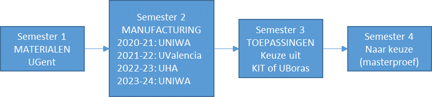 Het programma is opgebouwd in 3 thematische semesters die zich richten op materialen, manufacturing en toepassingen. Hoewel uiteraard ook courante stoffen aan bod komen, ligt de klemtoon van de opleiding toch op geavanceerde en hoogtechnologische materialen, processen en toepassingen.