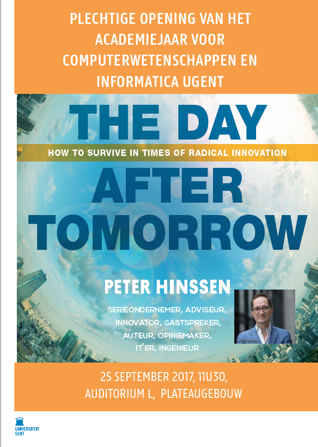 De wereld evolueert steeds sneller met grote gevolgen voor de organisaties van vandaag. Om je stevig te verankeren voor de toekomst moet je werken als een innovator: niet langer denken aan morgen, maar aan de dagen erna. Zij slagen erin om hele industrieën van richting te doen veranderen. De toekomst zal volgens Peter Hinssen specifieke bedrijfsmodellen, organisatiemodellen, talenten, attitudes en de cultuur nodig hebben om als organisatie te overleven in tijden van radicale innovatie. Het spreekt voor zich dat zijn inzichten bijzonder relevant zijn voor de studenten en onderzoekers van onze it-opleidingen.