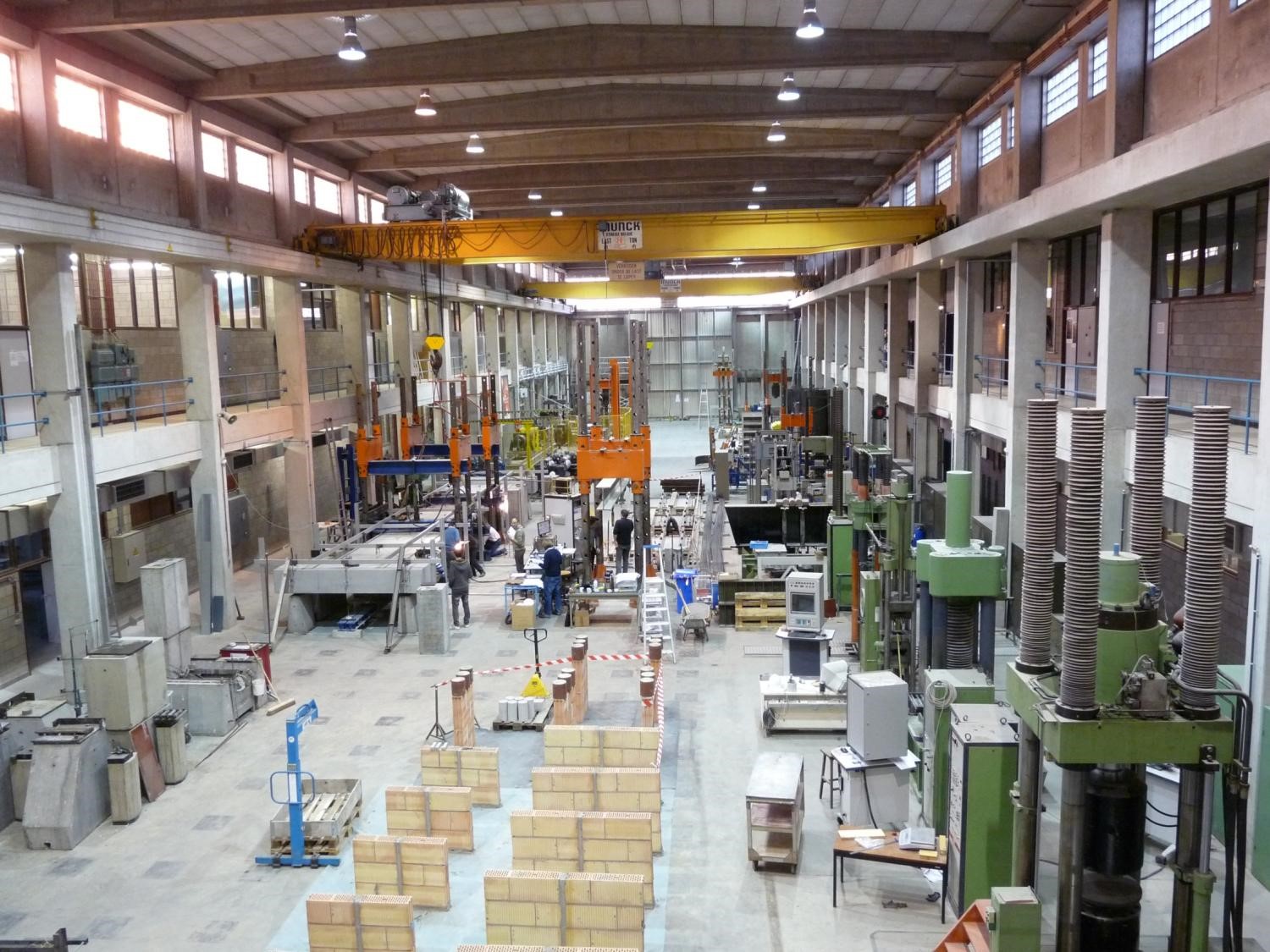 The total floor surface of about 1000m² and can withstand vertical loads up to 1 000 kN every 1.20 m and horizontal forces of 1000 kN per running meter at a level of 1 m. This strong floor in combination with specially designed steel frames, hydraulic actuators and dedicated measurement equipment, is used to perform full-scale load testing on a wide range of construction elements, often in relation to or complemented by materials and sustainability research. The latter is supported by climate rooms and material testing lab space surrounding the main testing hall with the strong floor, and allowing to evaluate the physico-mechanical and durability performance of construction materials as well.