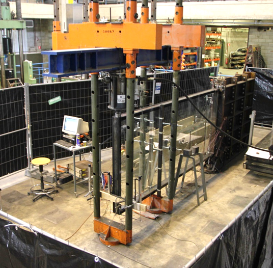 Structural safety of glass building components, such as glass beams, glass columns, walkable glass floors, and their connections is of utmost importance. To ensure sufficient structural safety and load-bearing capacity – also in partly or fully broken condition - laminated solutions, possibly provided with (stainless) steel reinforcement are typically used, which however typically provide a high dependency on temperature and loading time. Often well-chosen experimental testing is essential to validate sophisticated numerical models.