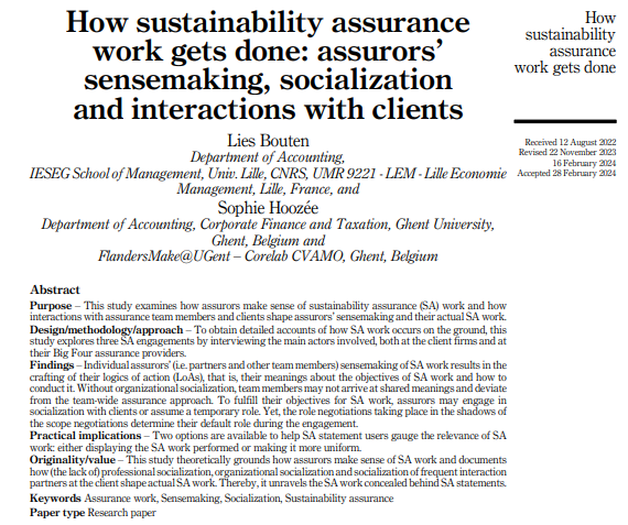 Full reference: Bouten, L., & Hoozée, S. 2024. How sustainability assurance work gets done: assurors’ sensemaking, socialization and interactions with clients. Accounting, Auditing & Accountability Journal.