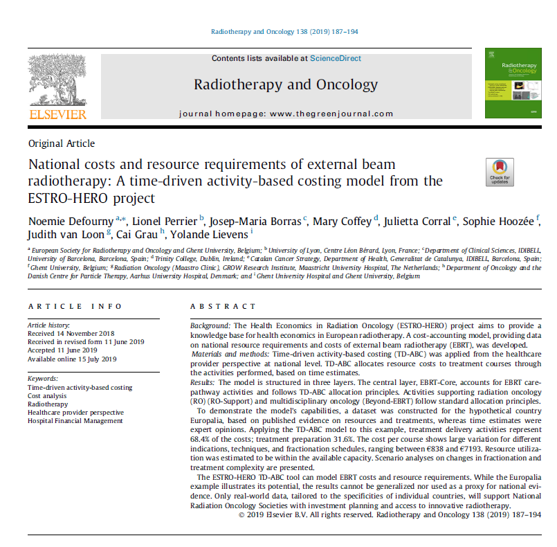 Reference: Defourny, N., Perrier, L., Borras, J.-M., Coffey, M., Corral, J., Dunscombe, P., Hoozée, S., van Loon, J., Grau, C., Lievens, Y., 2019. National costs and resource requirements of external beam radiotherapy: a time-driven activity-based costing model from the ESTRO-HERO project. Radiotherapy & Oncology, 138, 187-194.