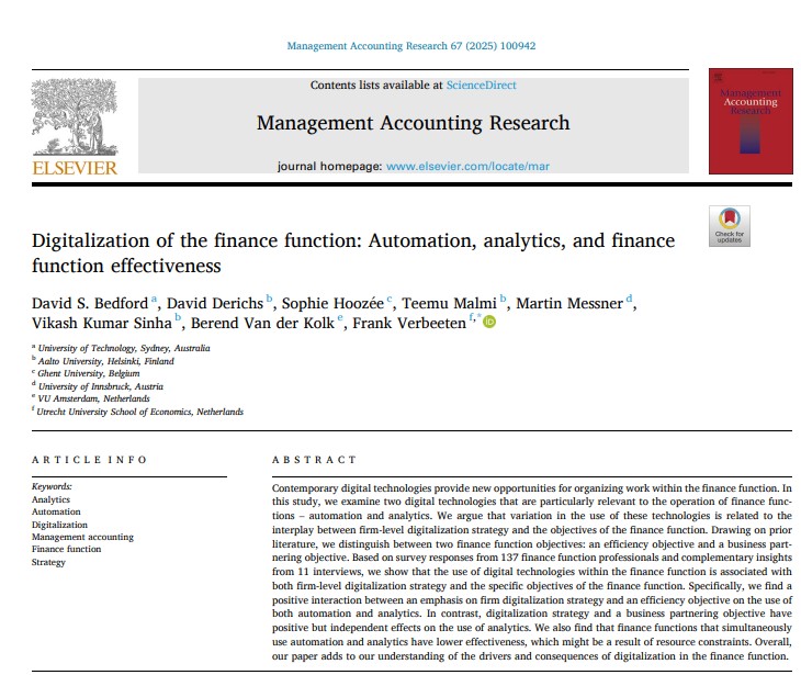 Full reference: Bedford, D. S., Derichs, D., Hoozée, S., Malmi, T., Messner, M., Sinha, V. K., Van der Kolk, B. & Verbeeten, F. (2025). Digitalization of the finance function: Automation, analytics, and finance function effectiveness. Management Accounting Research, 67, 100942.
