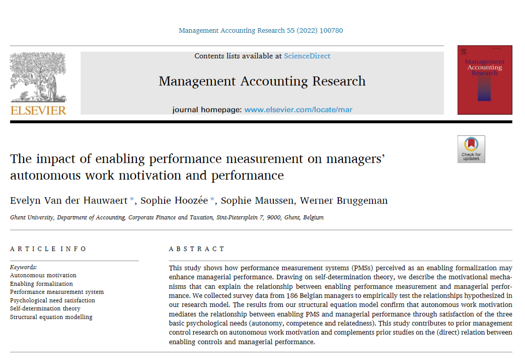 Reference: Van der Hauwaert, E., Bruggeman, W., Hoozée, S., Maussen, S., forthcoming. The impact of enabling performance measurement on managers’ work motivation and performance. Management Accounting Research.