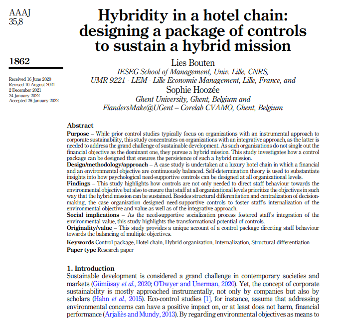 Reference: Bouten, L., Hoozée, S., forthcoming. Hybridity in a hotel chain: designing a package of controls to sustain a hybrid mission. Accounting, Auditing & Accountability Journal.